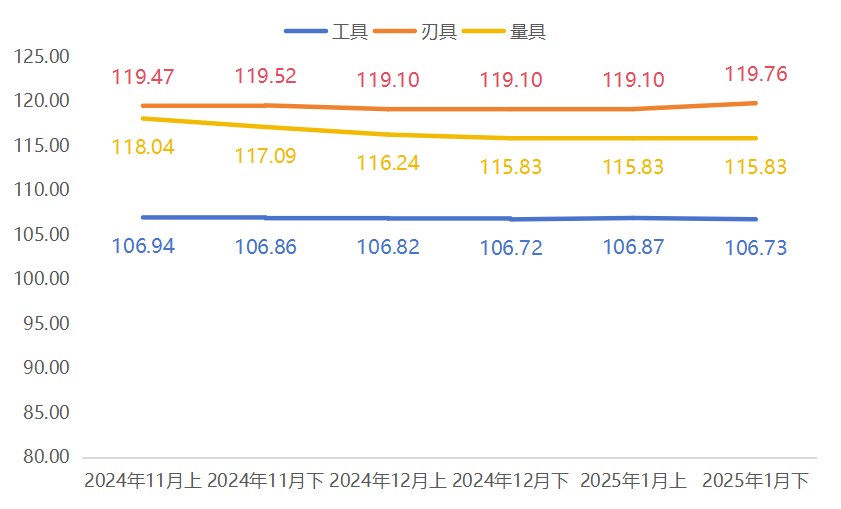 2025年1月,工量刃具价格指数持续回升,1月上、下半月环比分别上涨0.08点、0.20点,1月下半月指数为113.31点。相较于前两个月的微幅下行态势,1月的价格指数走势呈现出企稳回升的迹象,价格波动趋于稳定。