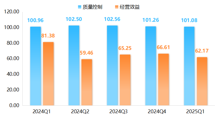 2025年一季度,质量控制指数稳中微跌,但仍处于较高位;经营效益指数小幅下滑,整体表现承压。