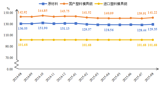 2025年8月,模具原材料价格指数小幅上涨,收于129.35点,环比上涨0.91点。细分来看,进口塑料模具钢和国产塑料模具钢价格指数表现为“一平一涨”。