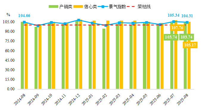 2025年8月,黄岩模具产业景气指数保持在景气区间运行,为104.31点,高于荣枯线4.31个百分点,行业整体运行态势稳中向好。细分来看,产销类景气指数继续在荣枯线上方运行,指数为103.74点,环比持平;信心类景气指数在扩张区间内略有回调,为105.17点,环比略降2.59个百分点,但高于荣枯线5.17个百分点,反映出企业对未来市场前景表现乐观。