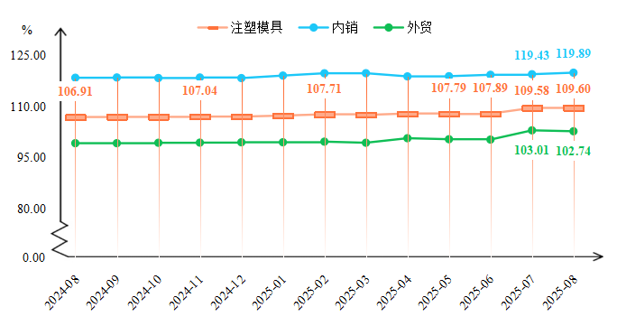 据“黄岩·中国模具指数”信息系统监测,2025年8月,注塑模具价格指数延续涨势,收于109.60点,环比略涨0.02点。细分来看,内外销市场价格指数一升一降。其中,内销市场保持稳健增长态势,模具价格指数收于119.89点,环比上涨0.46点;外销市场小幅走弱,指数收于102.74点,环比下跌0.27点。