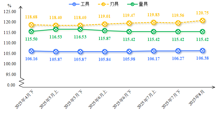 细分来看,2025年8月,三类分项指数表现为“两涨一平”。其中,刃具价格指数领涨,收于120.75点,较7月下半月上涨1.19个百分点;工具价格指数窄幅上行,收于106.38点,较7月下半月上涨0.11个百分点;量具产品整体市场供需相对稳定,价格指数保持在115.42点平稳运行。
