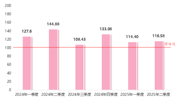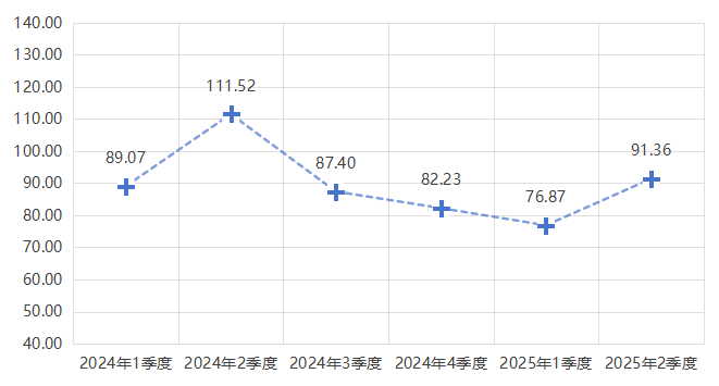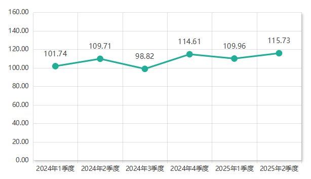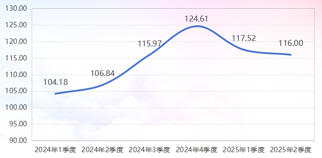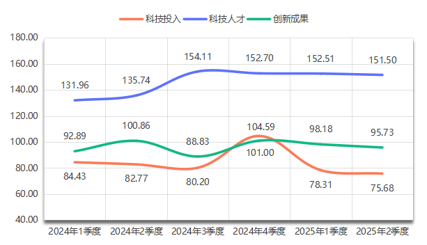 2025年上半年,科技创新指数回调企稳,具体来看:一季度指数高位回调,指数值为117.52点,环比下降5.69%。二季度指数值为116.00点,降幅收窄至1.30%。同比来看,2025年一、二季度分别较上年同期增长12.81%和8.57%。