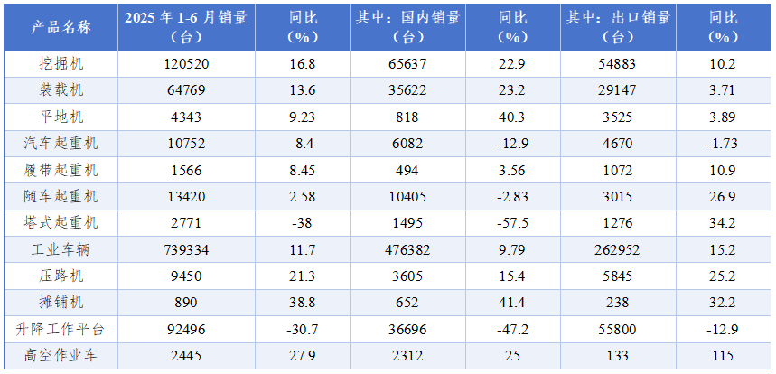 产品销售数据同样印证复苏趋势。据中国工程机械工业协会统计,2025年上半年挖掘机总销量达120520台,同比增长16.8%,其中境内市场销量同比增长22.9%,出口销量同比增长10.2%,内外需均有发力;装载机总销量64769台,同比增长13.6%,其中国内市场销量同比增长23.2%,内需拉动作用突出。此外,工业车辆、压路机、摊铺机、高空作业车等主要品类销量同比增幅均超两位数,分别达11.7%、21.3%、38.8%和27.9%,品类复苏覆盖面进一步扩大。