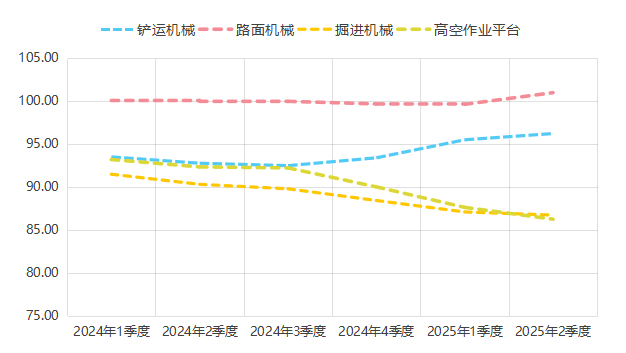 具体来看,2025年上半年,铲运机械价格指数持续上涨,路面机械价格指数先跌后涨,二季度分别为96.22点和100.98点,较2024年底分别上涨3.03%和1.32%。掘进机械和高空作业平台价格指数均呈持续下行状态,二季度指数值分别为86.72点和86.25点,较2024年底分别下跌1.92%和4.18%。