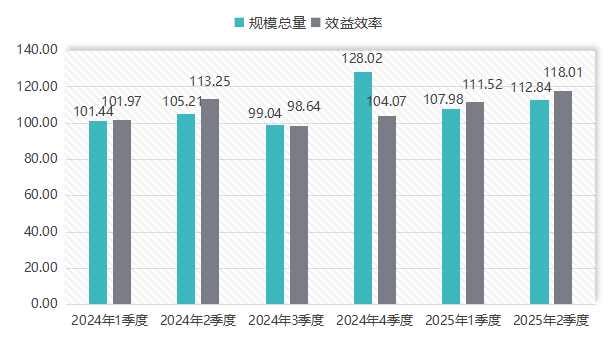 产业发展指数下设规模总量和效益效率两个指数,其中规模总量指数持续回暖。2024年四季度为工程机械销售旺季,规模总量指数呈现快速上升趋势;2025年一季度进入传统销售淡季,规模总量指数回落较为明显;二季度产业发展回暖,规模总量指数环比增长4.50%至112.84点。