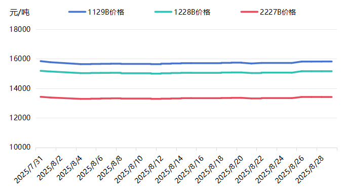 成本方面,截至8月29日,中国棉花协会公布的1129B、1228B价格分别为15817、15164元/吨,较7月31日分别下降0.16%、0.06%。2227B价格为13412元/吨,较7月31日上涨0.02%。
