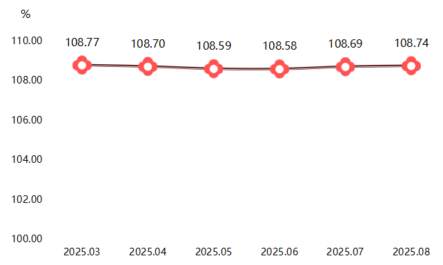 2025年8月,高阳纺织产品价格总指数为108.74点,环比上涨0.04%,虽涨幅收窄,但仍延续上期企稳态势,表明纺织市场整体价格水平趋于稳定。