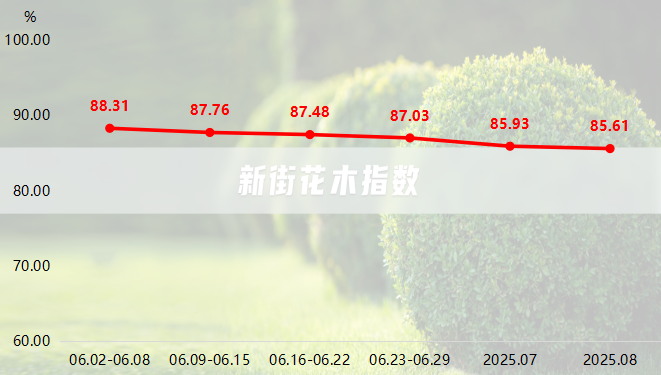 8月花木市场整体呈现出“前弱后强、分化加剧”的转折性特征。中上旬,受高温天气持续影响,市场交易活动仍较为清淡;进入下旬之后,随着气温回落和传统销售旺季的临近,市场购销氛围逐步回暖,询价和备货行为有所增多,显现出明显的触底企稳信号。据“中国·萧山新街花木指数”信息系统监测,2025年8月,新街花木产品价格指数收于85.61点,环比虽下滑0.32点,但整体降幅有所收窄。具体运行情况如下图所示: