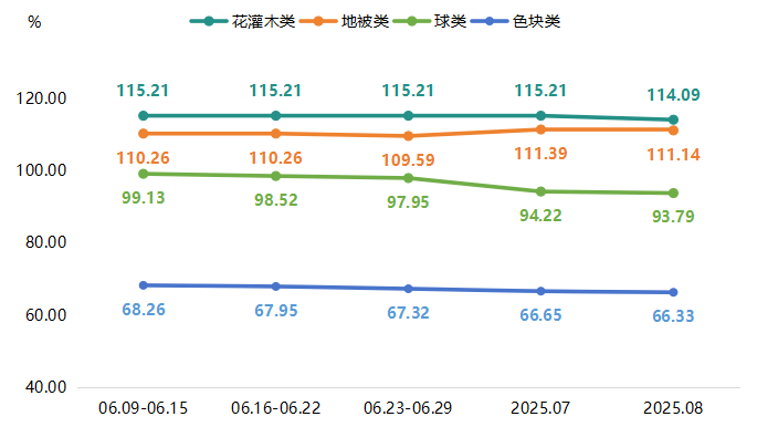 2025年8月,花灌木类、地被类、球类和色块类产品价格指数均小幅下行,具体走势如下图所示: