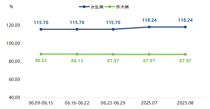 2025年8月,水生类、乔木类产品价格指数分别保持在118.24点和87.97点稳定运行,无明显变化。具体运行情况如下图所示: