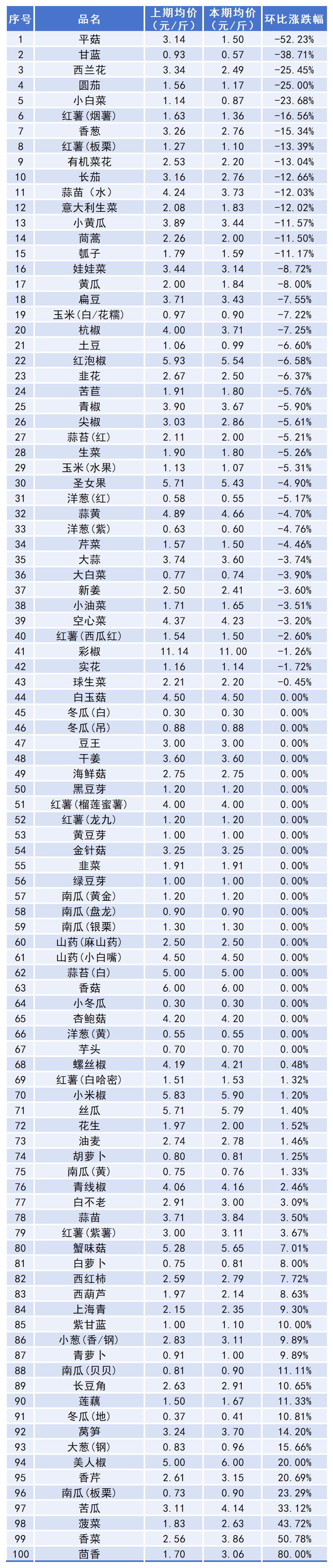 从具体蔬菜品种来看,本期价格上涨的蔬菜有33种,占总蔬菜品种33.00%,其中茴香本期均价3.06元/斤,上期均价1.70元/斤,环比涨幅达80.00%;价格下跌的蔬菜有43种,占总蔬菜品种43.00%,其中平菇本期均价1.50元/斤,上期均价3.14元/斤,环比下降52.23%;本期价格持平的蔬菜有24种。