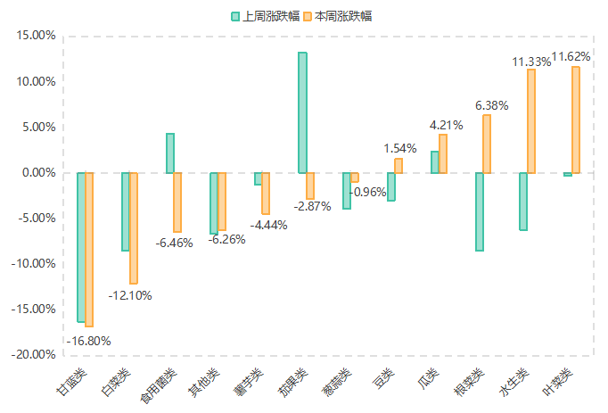 价格指数上升品类中:豆类(1.54%)、根菜类(6.38%)、水生类(11.33%)以及叶菜类(11.62%)蔬菜价格指数本期均止降为升;瓜类蔬菜价格指数本期升幅扩大至4.21%。