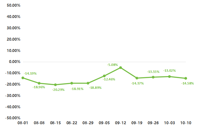 同比来看,本期蔬菜价格指数相较去年同期仍处于较低水平,本期同比降幅为14.58%。