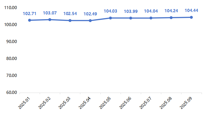 据“沧县·中国红枣及干果坚果食品产业指数”信息系统监测,2025年三季度,沧县红枣及干果坚果产品价格指数稳中有升,9月指数收于104.44点,较6月上涨0.45点。具体运行情况如下图所示:
