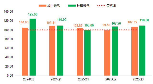 产业景气指数下设加工景气指数和种植景气指数。2025年三季度两类景气指数运行情况如下图所示: