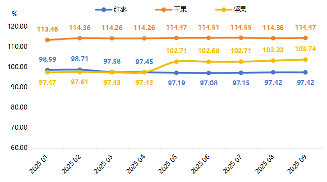 红枣及干果坚果产品价格指数下设红枣、干果、坚果三类产品价格指数,2025年三季度三类产品价格指数走势如下图所示: