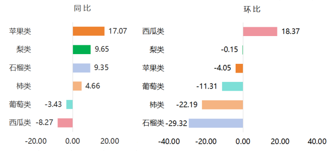 同比价格指数:四川、云南等主产区的软籽石榴市场需求增加,尤其是礼盒装优质优价明显,加上各渠道积极布局,推动石榴类价格同比明显上涨。
