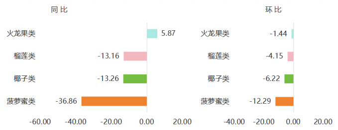 今年以来,泰国、越南等榴莲主产区迎来丰收,产地供应大幅增加,品质相对偏低,价格整体表现不及上年同期,影响榴莲类同比、环比价格均表现下行。