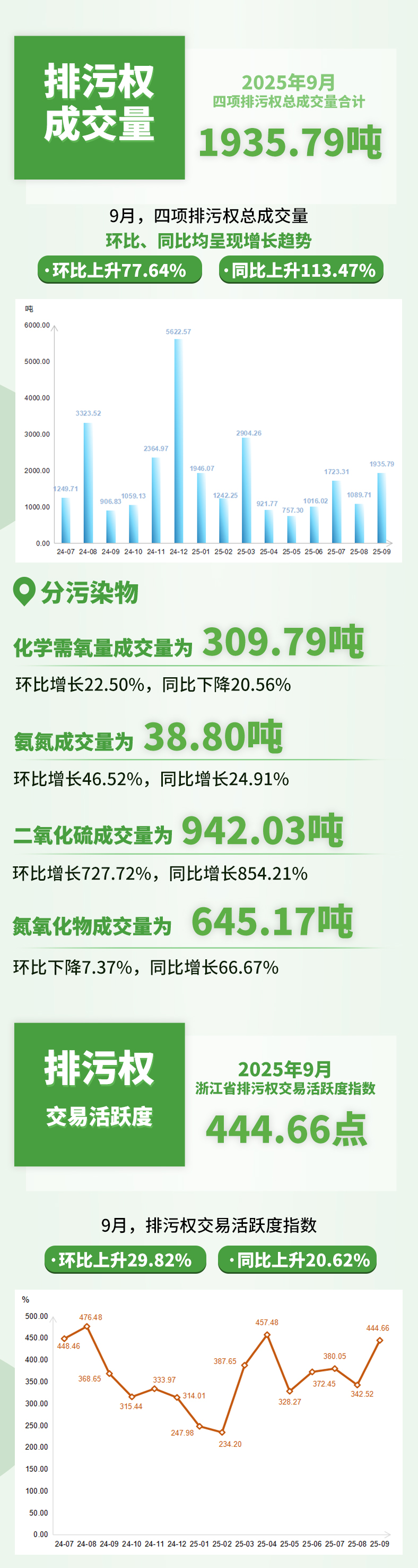 2025年9月,浙江省排污权交易指数环比、同比均呈现上升态势。COD(化学需氧量)、NH3-N(氨氮)、SO2(二氧化硫)、NOx(氮氧化物)四种主要污染物交易指数环比、同比均呈现“两降两升”态势,四种主要污染物的总成交量环比、同比均呈现增长态势。此外,浙江省排污权交易活跃度指数环比、同比均有所上升。