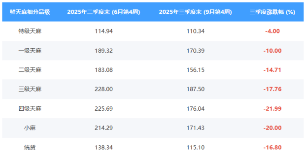 从细分品级看,三季度各品级鲜天麻价格指数普遍下跌,但跌幅存在差异。前期涨幅较大的三级、四级、小麻等中小规格天麻,在本轮回调中跌幅也相对显著,季度整体跌幅均超过15%。而特级、一级等高品质天麻价格相对坚挺,表现出较强的抗跌性。统货价格受市场整体行情影响,跌幅较大。