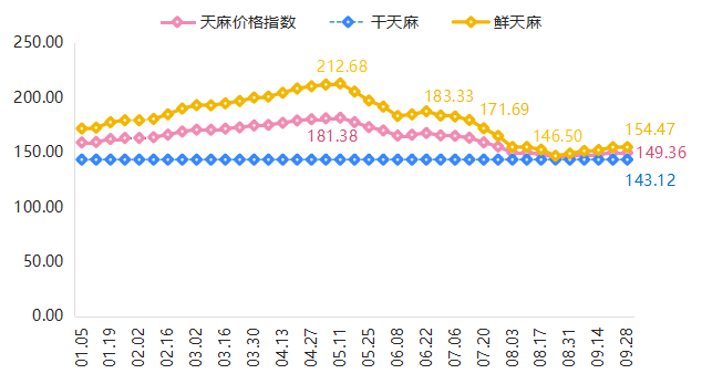 天麻价格指数在三季度的走势与总指数基本同步,呈现“连续下行触底、缓慢企稳回升”的态势。指数从6月第4周的165.24点持续下跌至8月第4周的144.98点,跌幅达到12.26%;随后在鲜天麻价格稳中有升的拉动下,最终缓慢上行至9月第4周收于149.36点,季度累计下跌9.61%。