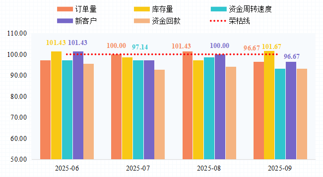 9月,衡水工程橡胶企业经营类景气指数整体表现较差,仅有一项指标位于景气区间,其余指标均有待提高。具体来看,库存量景气指数表现较好,收于101.67点,位于景气区间;订单量景气指数收于96.67点,跌破至荣枯线下方运行;资金周转速度、新客户和资金回款等指标持续位于荣枯线下方运行。