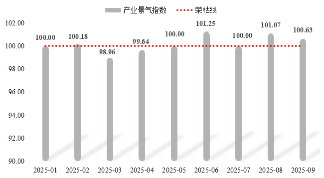 2025年三季度,衡水工程橡胶产业景气指数整体表现较好,各月景气指数均位于景气区间,表明行业整体发展情况良好,市场信心较为充足。具体运行情况如下图所示: