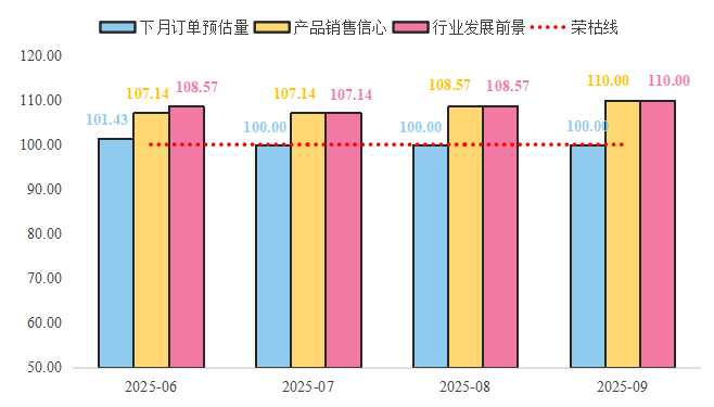具体来看,三季度企业对各月订单预估量较为保守,下月订单预估量景气指数持续收于100.00点,整体较为稳定;产品销售信心和行业发展前景景气指数表现良好,各月均位于荣枯线上方运行,处于较高景气区间,企业对自身产品销售信心和行业发展前景持较高预期。
