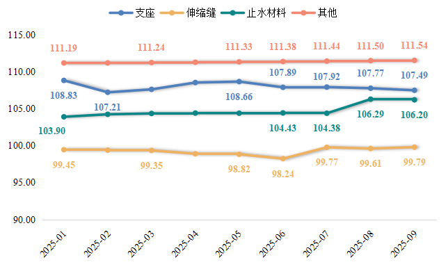 其他类产品价格指数整体表现相对平稳,始终在114.40-114.60点之间窄幅波动。具体来看,其细分产品价格多数保持稳定运行,仅盾构密封材料价格小幅变动,致使其他类产品价格指数窄幅波动。