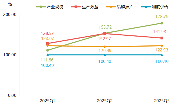 2025年三季度,枣强复合材料产业规模在调整后展现韧性,品牌建设取得进展,整体呈“规模驱动恢复,但效益有待改善”图景。具体来看,产业规模指数快速反弹,三季度指数收于178.79点,较二季度增长16.31%,成为拉动产业发展指数回升的主要动力,表明产能利用率和投资活动积极发展。生产效益指数明显回落,三季度指数为141.93点,较二季度下降7.22%,同比降幅达26.33%,表明在市场需求、成本传导等因素影响下,企业整体盈利能力面临较大压力。品牌推广指数稳步提升,三季度指数收报122.93点,环比增长2.03%,同比增长16.03%,表明枣强复合材料产业在品牌建设和市场开拓方面的持续投入取得了积极成效,品牌影响力逆势提升。得益于产业发展政策环境和制度保障保持连续性和稳定性,制度供给指数保持稳定,三季度指数为100.40点,与二季度持平,同比增长2.24%。