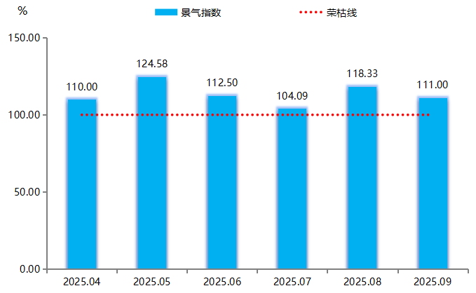2025年三季度,发展信心类景气指数始终在高位景气区间运行,展现出强劲的韧性。指数从6月的106.25点大幅跃升至7月的154.55点;8月维持在154.17点的高位;9月虽有所回落,但仍达到145.00点,高出荣枯线45.00个百分点,表明在产业转型升级的推进、政策支持的延续以及新应用领域的拓展背景下,企业家对行业中长期发展前景充满信心。经营类景气指数承压运行,三季度呈“V型”波动但整体偏弱。指数从6月的101.39点降至7月的83.33点,跌破荣枯线;8月虽反弹至102.78点,但9月再度回落至96.67点,位于不景气区间,表明企业当期的实际经营状况面临一定压力,市场需求、成本控制等方面存在挑战。