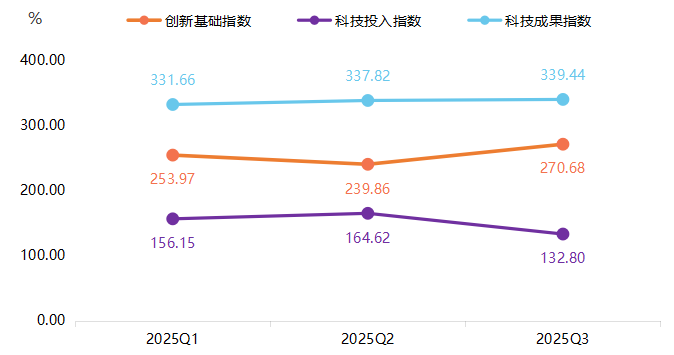 2025年三季度,产业科技创新体系展现出强劲韧性。在科技投入指数环比出现一定回调的情况下,科技成果指数依然稳定在339.44点的历史高位,环比保持增长。与此同时,代表创新环境和长期潜力的创新基础指数实现强劲增长,表明创新活动的“投入-产出”效率显著提升。