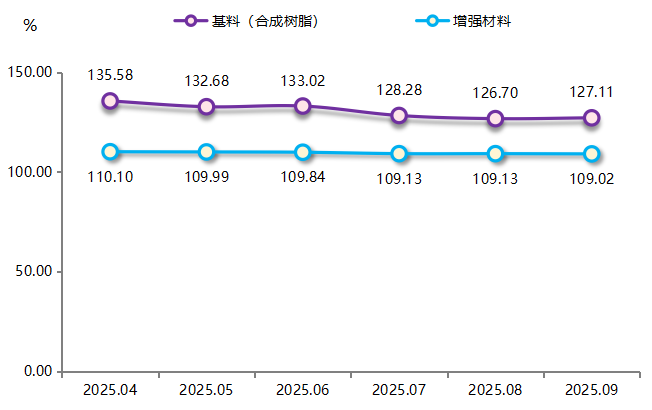 当前基料领域产能过剩矛盾尚未根本缓解,且其主要上游产品价格仍处下行通道,成本支撑持续减弱;同时,以玻璃纤维为代表的增强材料市场同样面临供给压力。尽管9月原料价格指数环比已有企稳迹象,但在下游需求未显著改善前,供需基本面或将难以支撑价格持续反弹,原材料价格指数大概率承压波动运行。
