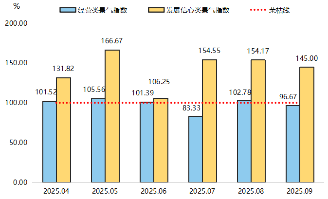 2025年三季度,产业景气指数走势呈结构性分化。一方面,企业发展信心持续高涨。2025年三季度,发展信心类景气指数始终在145点以上的高位景气区间运行,表明企业家对行业前景普遍乐观。另一方面,企业实际经营压力犹存。同期,经营类景气指数在荣枯线附近波动,9月指数为96.67点,环比有所回落,反映出企业当期在订单、利润、成本等方面仍面临现实挑战。针对产业运行呈“预期热、经营冷”的“温差”现象,需着力畅通微观传导机制。
