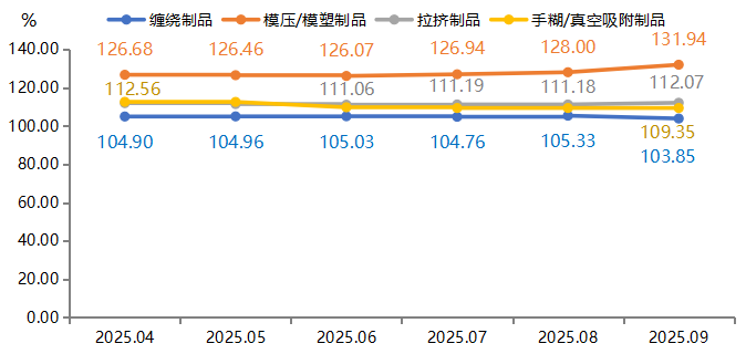 2025年三季度,模压/模塑制品价格指数强势领涨,9月指数收报于131.94点,较6月上涨4.66%,成为推动整体产品价格指数上升的核心动力。本期上涨主要得益于交通运输和建筑工程等领域需求的释放。拉挤制品价格指数稳步上行,9月指数为112.07点,累计上涨0.92%。在风电光伏边框、电力通信支架等新兴应用领域需求的稳定支撑下,其价格保持温和上升。缠绕制品价格指数承压下行,9月收于103.85点,较6月下行1.12%,部分市政基建项目进度波动,对管道、储罐等缠绕制品的订单形成一定影响,导致价格走势相对疲软。手糊/真空吸附制品价格指数稍有下行,9月指数为109.35点,较6月下跌0.34%,该类产品多用于定制化场景,如雕塑、特种构件等,需求相对稳定,价格波动幅度有限。