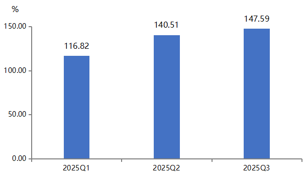 2025年三季度,复合材料产业发展指数收报于147.59点,较二季度提升5.04%,显示季度内产业活动有所恢复;然而,与2024年同期较高基数相比,指数同比仍下降15.17%,反映出产业发展整体仍处于调整与修复阶段。
