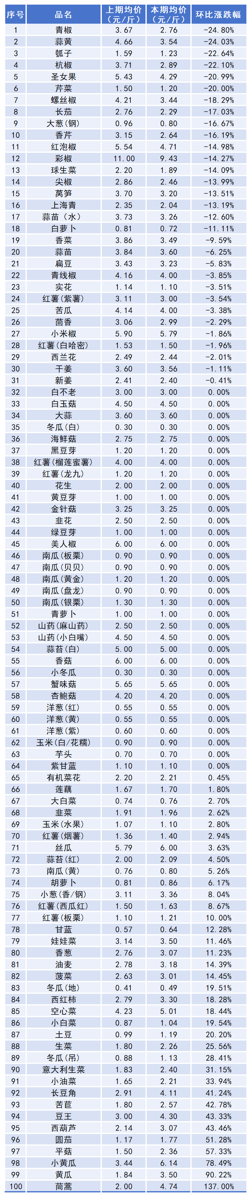 四、本期蔬菜价格涨跌表
