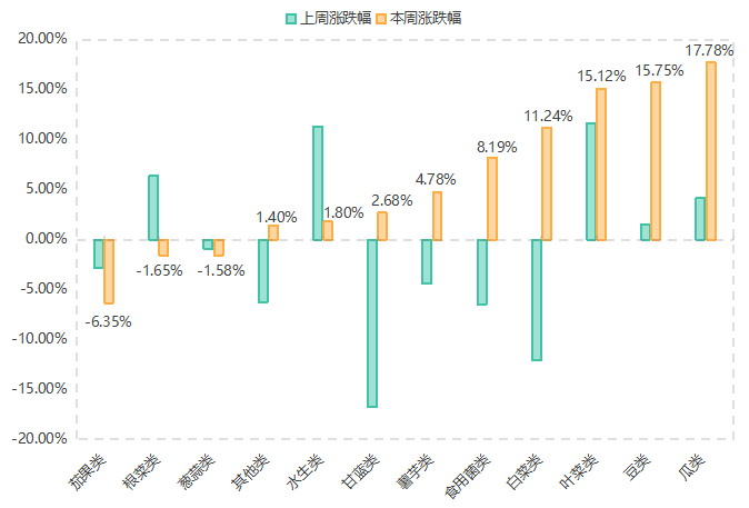 价格指数上升品类中:其他类(1.40%)、甘蓝类(2.68%)、薯芋类(4.78%)、食用菌类(8.19%)、白菜类(11.24%)蔬菜价格指数本期均止降为升;水生类(1.80%)蔬菜价格指数本期升幅有所收窄;叶菜类(15.12%)、豆类(15.75%)、瓜类(17.78%)蔬菜价格指数本期升幅均有所扩大。