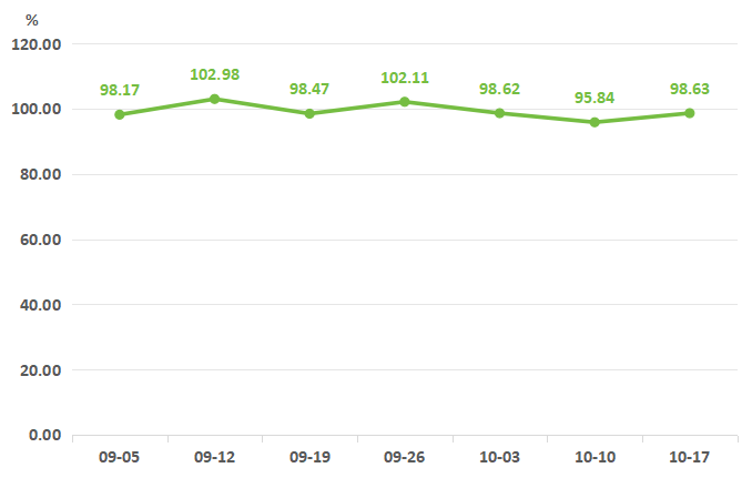 据“南大堡市场蔬果指数”信息系统监测,本期蔬菜(周定基)价格指数止降为升,收于98.63点,环比上升2.91%。