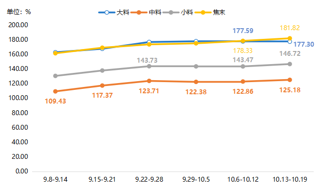 细分产品中,各价格指数“三升一降”。具体来看,中料、焦末价格指数继续上升,本期指数分别为125.18点、181.82点,环比涨幅分别为1.89%、1.96%;小料价格指数止降回暖,本期涨幅为2.26%,上涨较为明显;大料价格指数稳中略降,本期降幅为0.16%。
