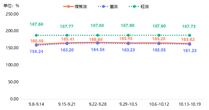 本期,煤焦油价格指数收报于163.62点,环比下降1.01%。受国际油价持续下跌影响,加氢产品价格走弱,导致加氢企业普遍看空后市,对原料煤焦油压价情绪增强,加之部分下游企业采购力度有所减弱,导致煤焦油价格下跌。细分产品中,重油、轻油价格指数均有下滑,环比降幅分别为1.11%、0.09%。