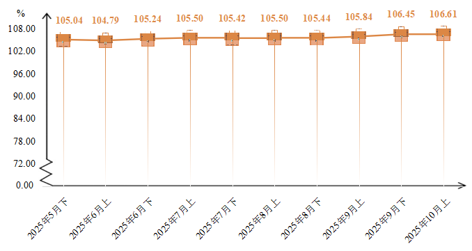 据“白沟·中国箱包指数”信息系统监测,2025年10月上半月,箱包产品价格指数继续上行,收于106.61点,环比涨幅0.15%,指数水平进一步突破2025年以来最高值,显示白沟箱包产业发展稳定向好。