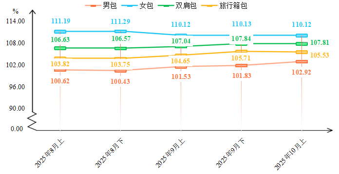 10月上半月,四类细分产品价格指数表现分化。其中,男包价格指数成为唯一上涨的品类,收于102.92点,环比涨幅1.07%;双节假期出行前的备货需求释放结束后,旅行箱包双肩包市场进入短暂回调期,价格指数由涨转跌,分别收于105.53点和107.81点,环比分别下跌0.17%和0.03%;女包价格指数略有下滑,收于110.12点,环比下降0.01个百分点。