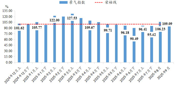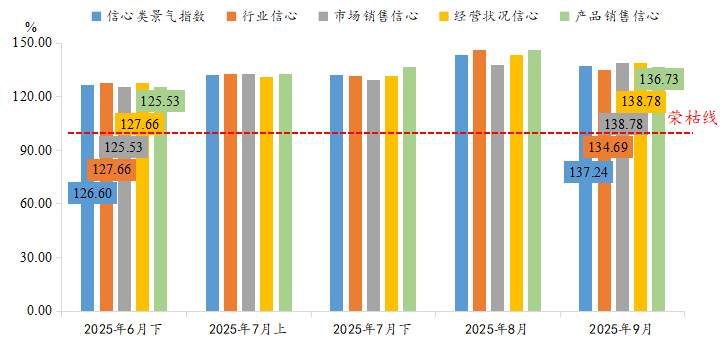 2025年三季度,信心类景气指数持续领跑,各期运行水平稳定保持在荣枯线上方,9月指数为137.24点,较6月下高出10.64个百分点。细分来看,各分项指标均持续处于高景气区间运行并连续上行,9月行业信心指数达134.69点,市场销售信心指数攀升至138.78点,印证前期点评中“金九银十预期”的前瞻性判断。进一步来看,对比经营类景气指数,信心类景气指数增速明显较快,呈现出“信心强于经营”的特征,反映出企业对行业转型升级和长期发展的积极预期,为后续经营改善提供心理支撑。
