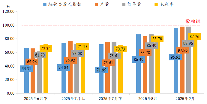 2025年三季度,经营类景气指数稳步提升,从7月上半月的74.04点回暖至9月的95.92点。细分来看,分项指标呈现出结构性改善,产量与订单量同步增长,9月两项指标均达到97.96点,显示生产端活跃度显著提升。但与此同时,毛利率指标9月回升至87.76点,复苏程度稍有滞后,反映当前行业复苏仍以“量增”驱动为主,价格传导机制尚未完全畅通,表明市场仍处于库存消化与价格博弈阶段。