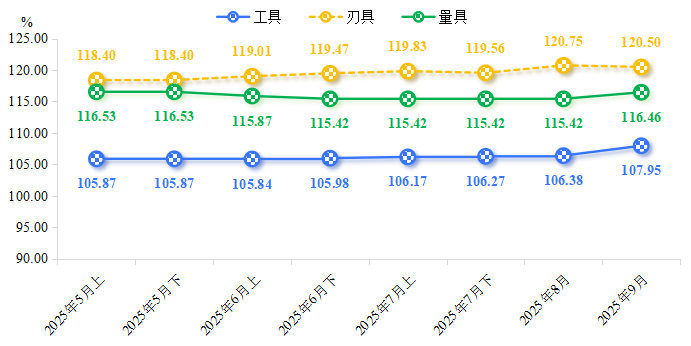 刃具产品作为兼具“资源属性”(钨依赖)与“技术属性”(精密加工)的品类,在成本上行与需求旺盛的双重驱动下表现最为突出。2025年三季度,刃具产品价格指数持续领跑,7月上、下半月分别收于119.83点和119.56点,8月进一步上涨至120.75点,增速明显加快,9月指数收于120.50点,环比小幅回落,但在三大细分品类中仍位居首位。