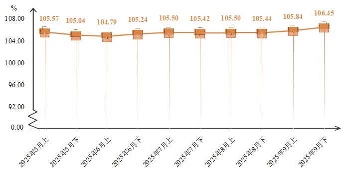 据“白沟·中国箱包指数”信息系统监测,2025年9月下半月,箱包产品价格指数延续上行走势,收于106.45点,环比涨幅0.58%,创下2025年以来最高值,显示“金九银十”传统旺季效应持续释放。