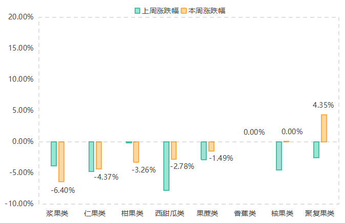 本期监测的八大类水果价格指数中,浆果类(-6.40%)柑果类(-3.26%)水果价格指数本期降幅有所扩大;仁果类(-4.37%)、西甜瓜类(-2.78%)、果蔗类(-1.49%)水果价格指数本期降幅有所收窄;聚复果类(4.35%)水果价格指数本期止降为升;香蕉类、核果类水果价格指数本期环比持平。