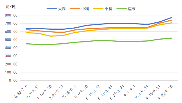 8月价格偏强。市场受块煤价格上涨及下游强需求影响,价格偏强运行,其中大料价格回归至700元/吨左右,中料、小料价格保持在600元/吨以上,焦末增幅相对较小,基本维持在485元/吨附近波动。
